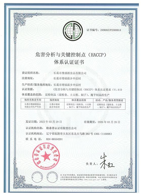 危害分析与关键控制点体系认证证书